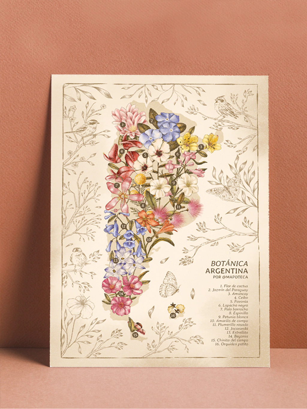 Ilustrado por Chili Ilustra, este mapa refleja con detalle y sensibilidad la belleza natural de nuestra flora nativa. En Mapoteca trabajamos con más de 80 artistas e ilustradores, orgullosos de apoyar su talento y difundir su mirada única al mundo.