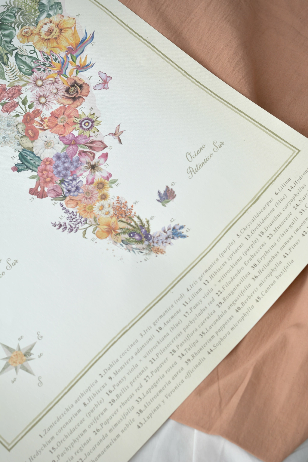 ¨Durante el proceso, me encontré viajando, desde playas en octubre disfrutando de los primeros días de calor, hasta tardes en la montaña a fines de noviembre, a orillas de algún río. Una de las cosas que más me inspira a la hora de ilustrar son los cuentos, las películas de aventura, y por sobre todo, las miniaturas. Este mapa viene a introducirnos en el mundo de los libros antiguos botánicos, esos de tapa dura, llenos de flores en tonos desaturados y hojas color crema. Me gusta pensar que este mapa (tanto el mapamundi como el de latinoamérica) van a ser esos que se miran de cerquita, donde la textura del papel y la técnica ilustrada potencian la composición y los detalles nos mantienen en pausa un rato.¨ explica la autora.
