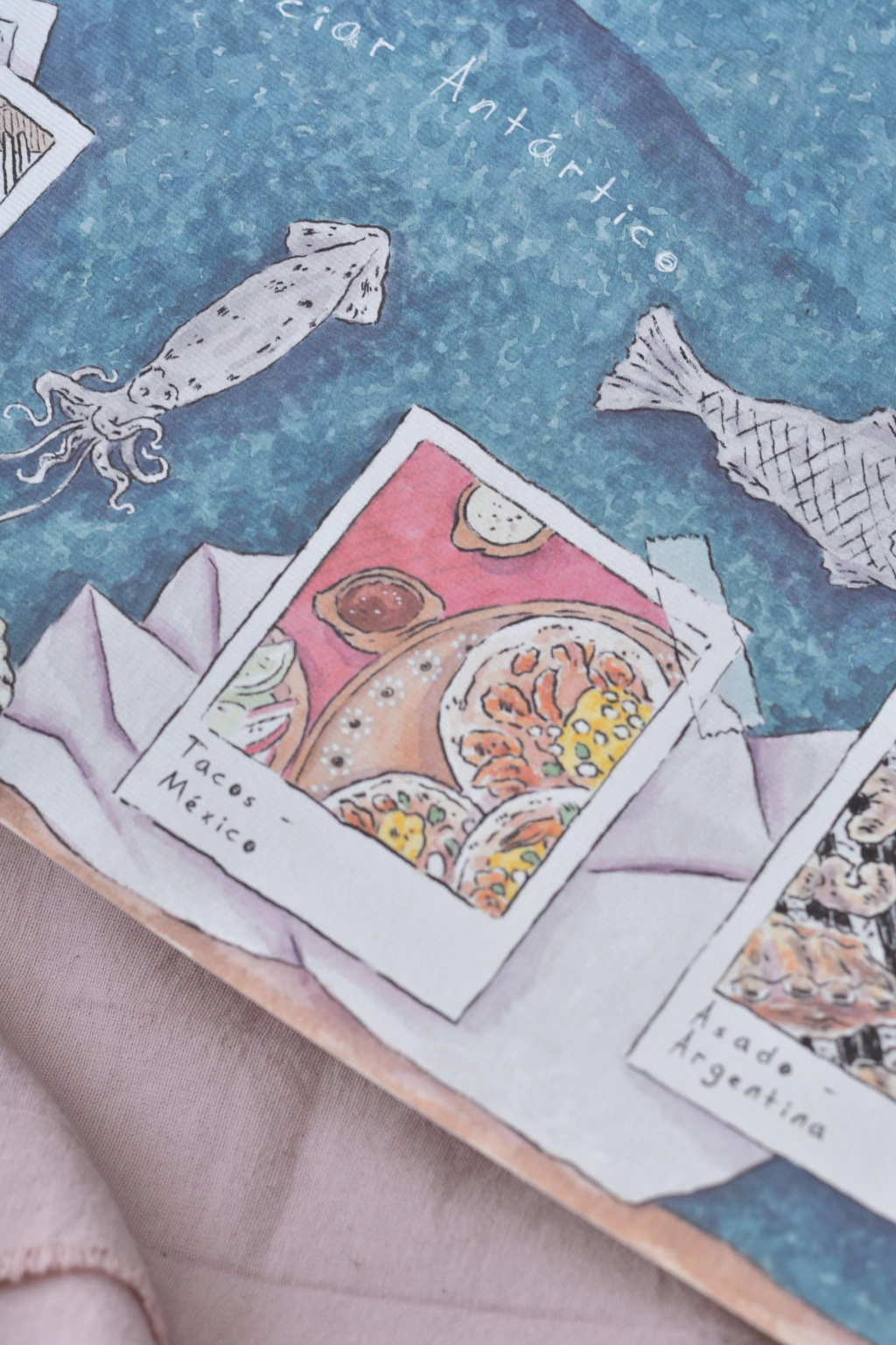 ¨Pensé el mapa del mundo ilustrado como una gran mesa, el mantel como los mares y los distintos continentes como servilletas, sobre ellas platos que representarán a los distintos países.