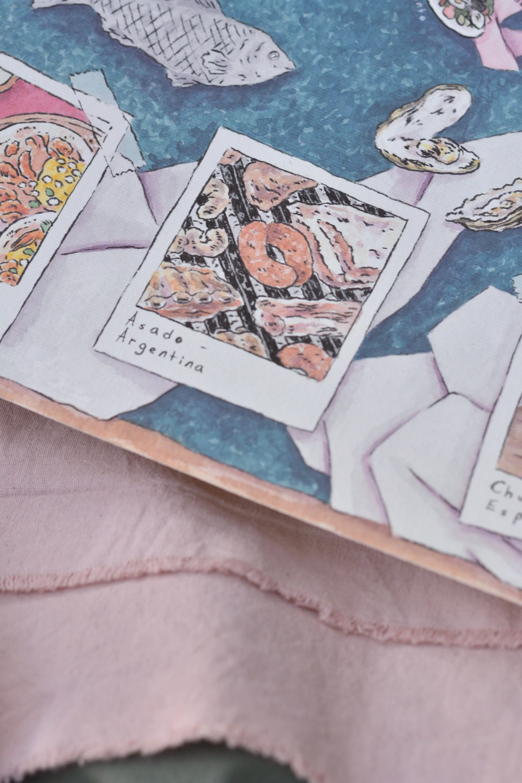 Mi punto de partida es Argentina por lo que decidí colocar a Latinoamérica en el centro del mapa. La investigación me llevó a recordar platos probados en viajes e informarme sobre platos en regiones que desconocía. La amplia diversidad y riqueza está presente en los colores de los platos debido a la vegetación de cada área, así como en las hibridaciones producto de diferentes contactos culturales que llevan a encontrar platos similares a pesar de la distancia o encontrarnos con platos totalmente diferentes.¨ explica la ilustradora.