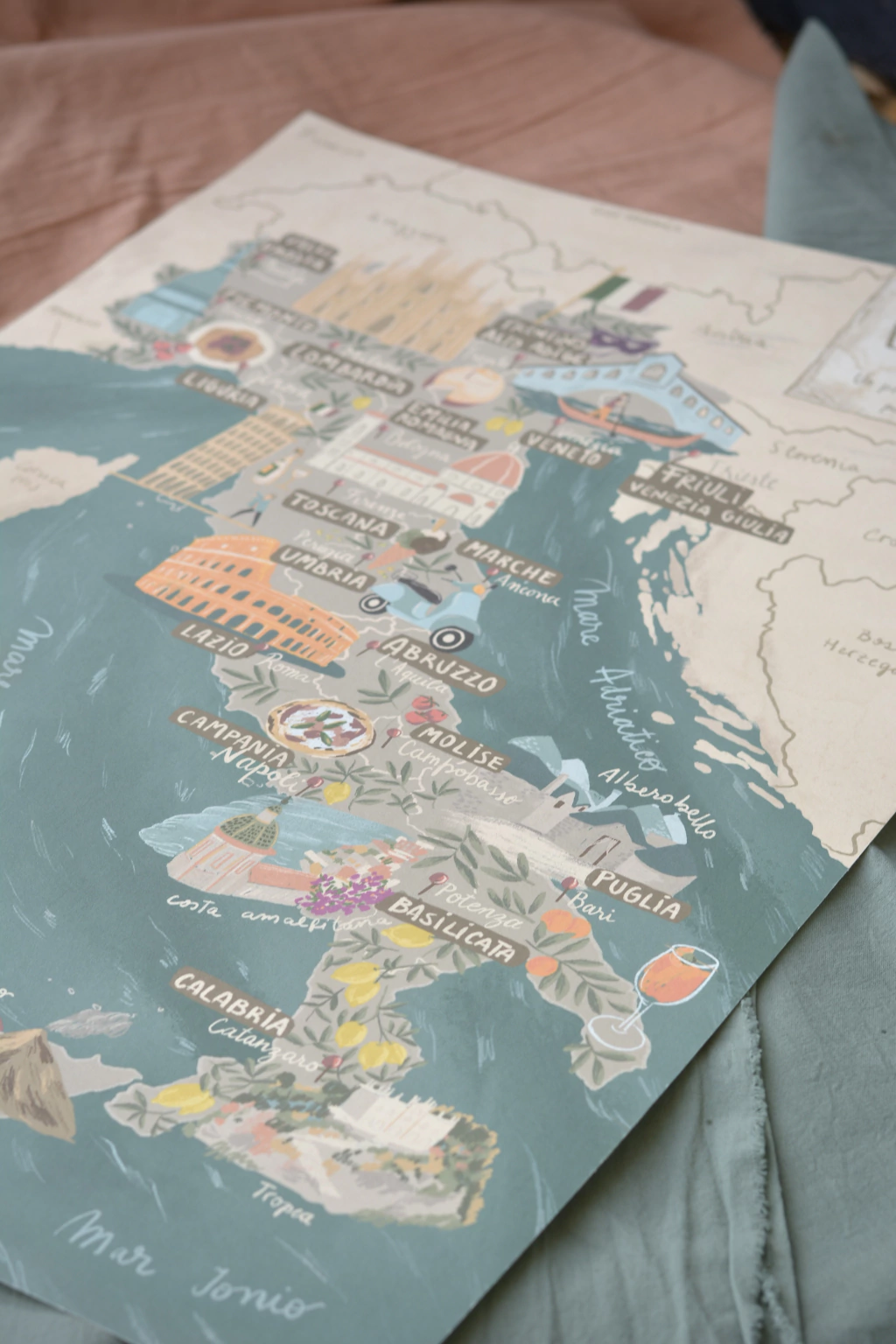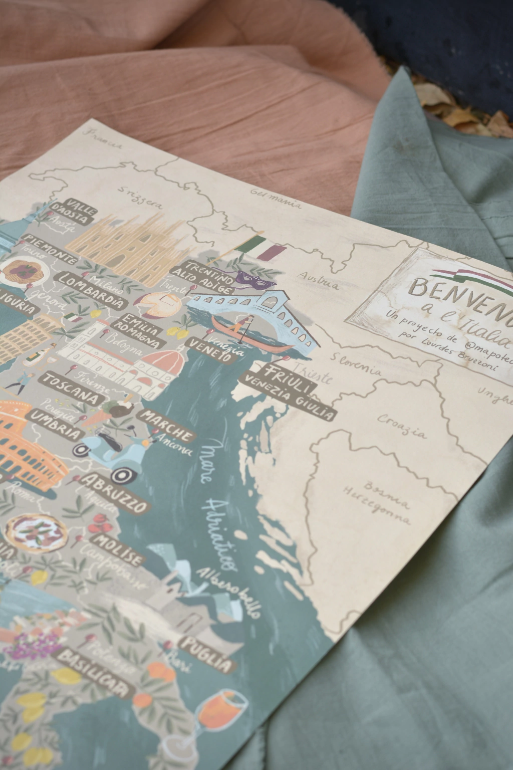 Italia es un país bellissimo. Empezando por su historia plasmada en obras arquitectónicas emocionantes, seguido por su gastronomía espectacular, sin dejar pasar las bellezas naturales. ¡Ojalá este mapa te abra el apetito de conocerlo un poco más!¨